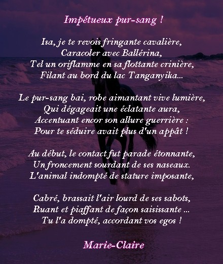 Des noms qui font voyager avec l'image de ce cheval fougueux que ta fille finit par dompter. Tu nous offres ici de belle images Clari.