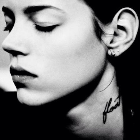 Sur cette troisième image une beauté sophistiquée , maquillée au top pour la photo , sans doute issue du mannequinat ... elle ne sourit pas mais est en pleine réflexion intérieure les yeux fermés sur ce qui l'entoure pour mieux s'isoler ...son tatouage "Float" exprime son insubmersibilité aux événement qui ne peuvent l'atteindre ...la couleur noir et blanc accentue l’effet dramatique ...